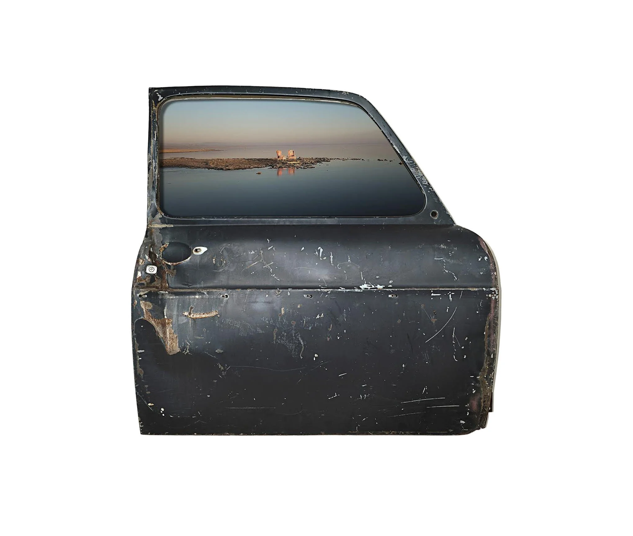 The weathered surface of this automotive door preserves evidence of distance traveled and time marked. Set within the frame, the shoreline photograph introduces a stillness that contrasts with the door’s worn exterior. The pairing creates a suspended moment where the view appears contained, yet slightly unguarded. The work holds memory inside a form shaped by years of use, presenting an object that feels found, paused, and shifting toward a new narrative.